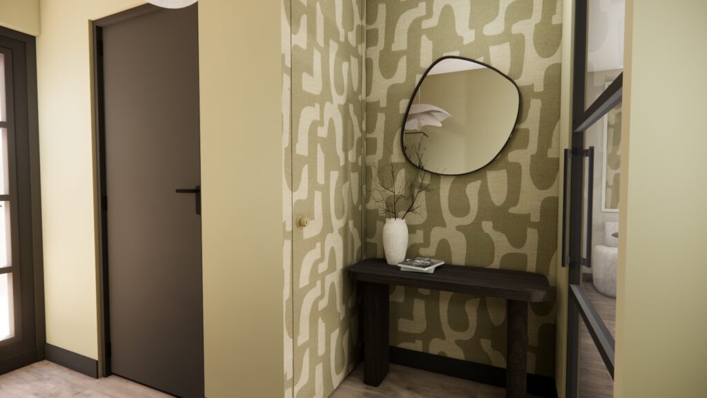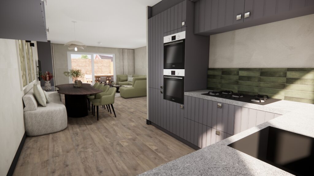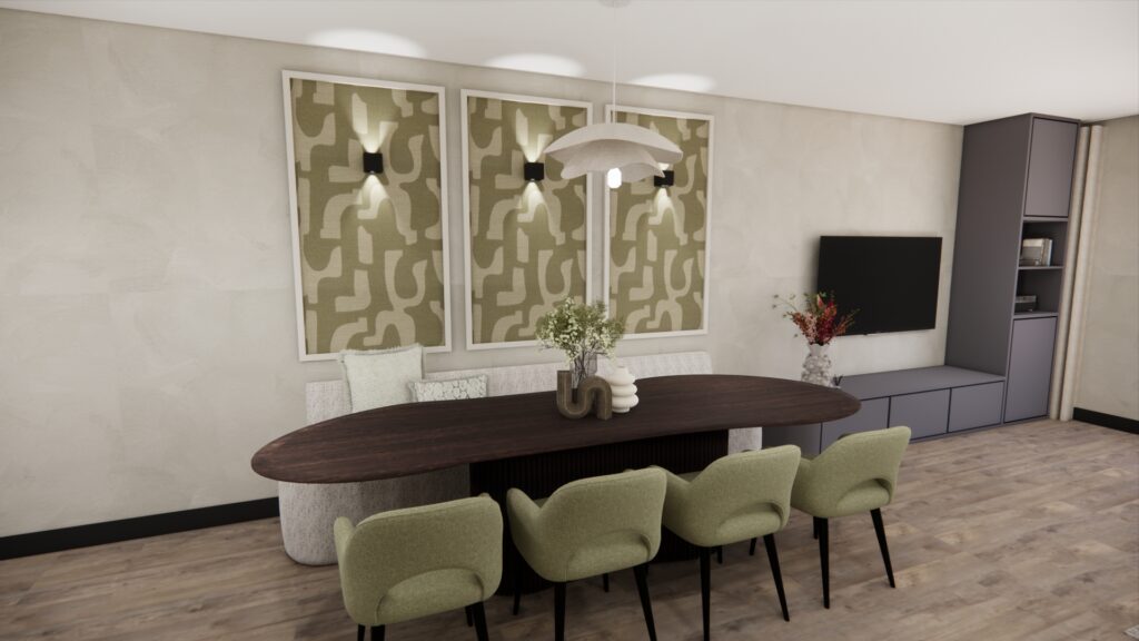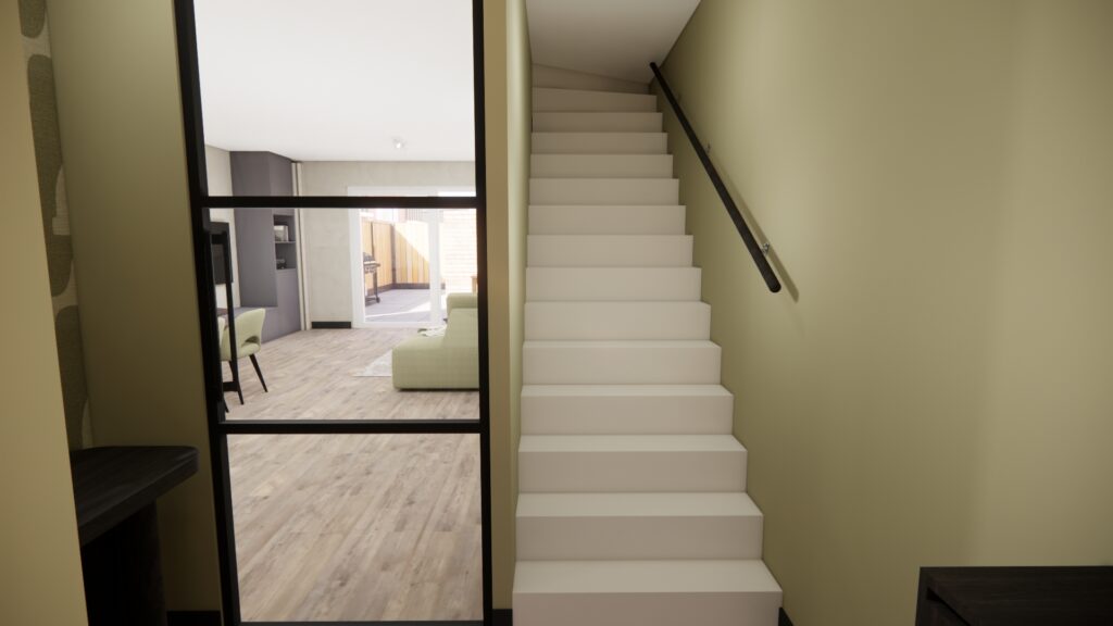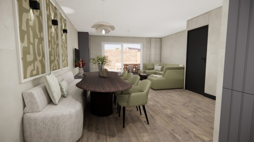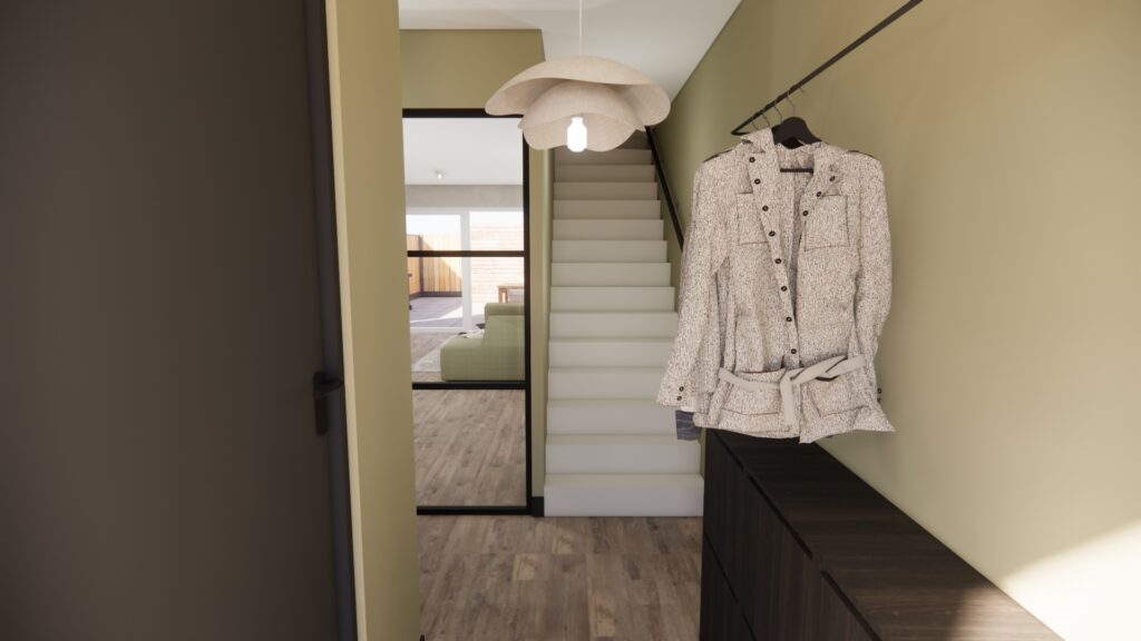 Wanneer je de hal binnenkomt, word je direct omarmd door de rust en gezelligheid. De groene tint in combinatie met het speelse behang geeft de hal een vrolijke en uitnodigende sfeer, die doorloopt in de gehele woonkamer. Hierdoor voelt de woning als een harmonieus geheel, wat rust en balans creëert. Met de opvallende accentdetails krijgt de woning een eigentijdse, stoere uitstraling. Zo is het een heerlijke plek om na een lange werkdag thuis te komen: netjes, rustig én gezellig.