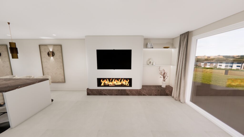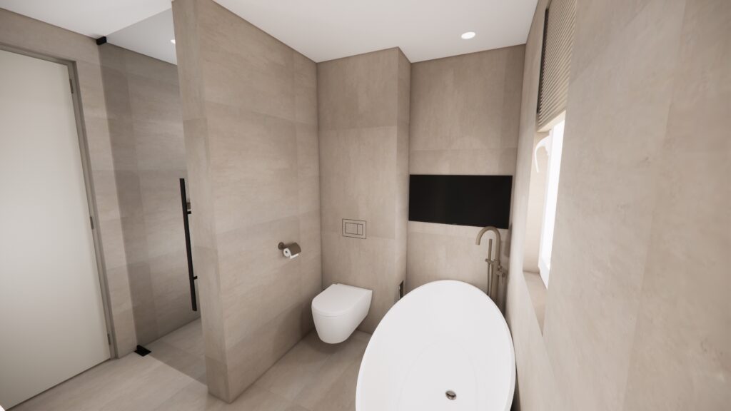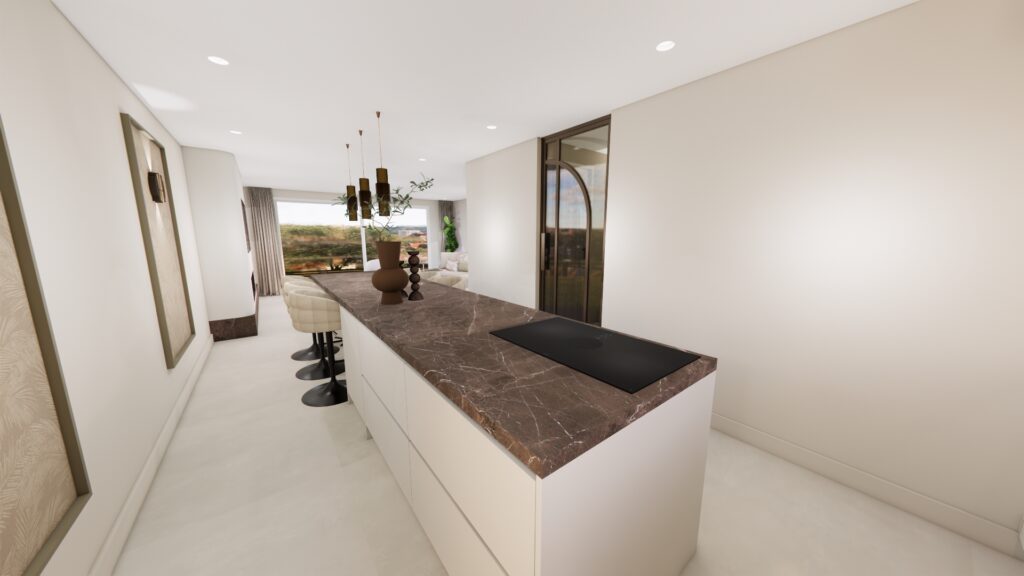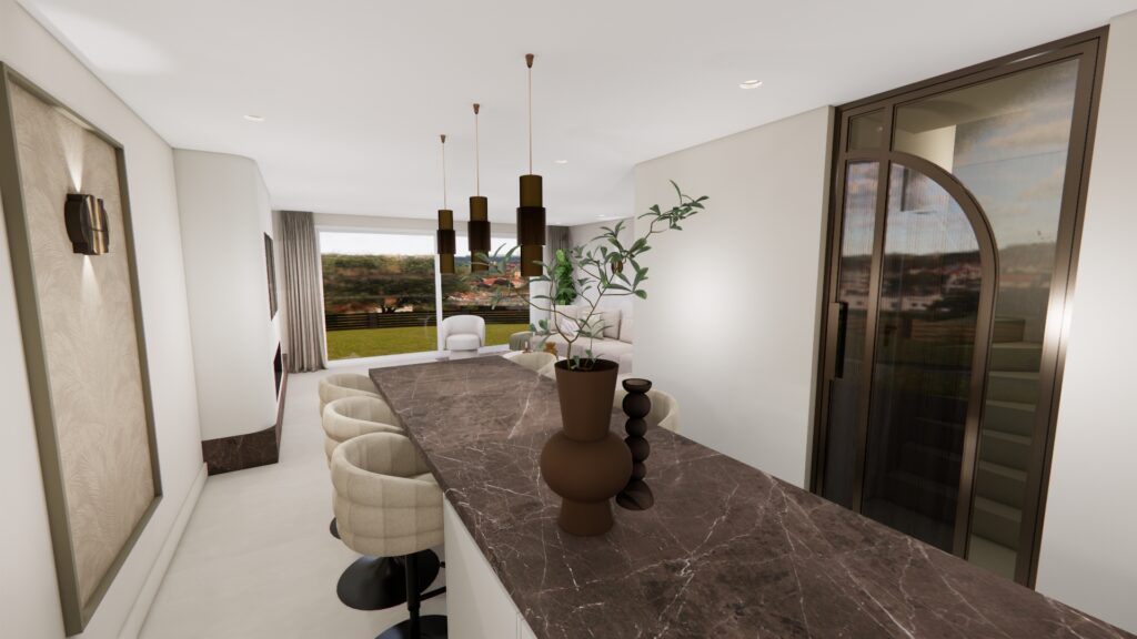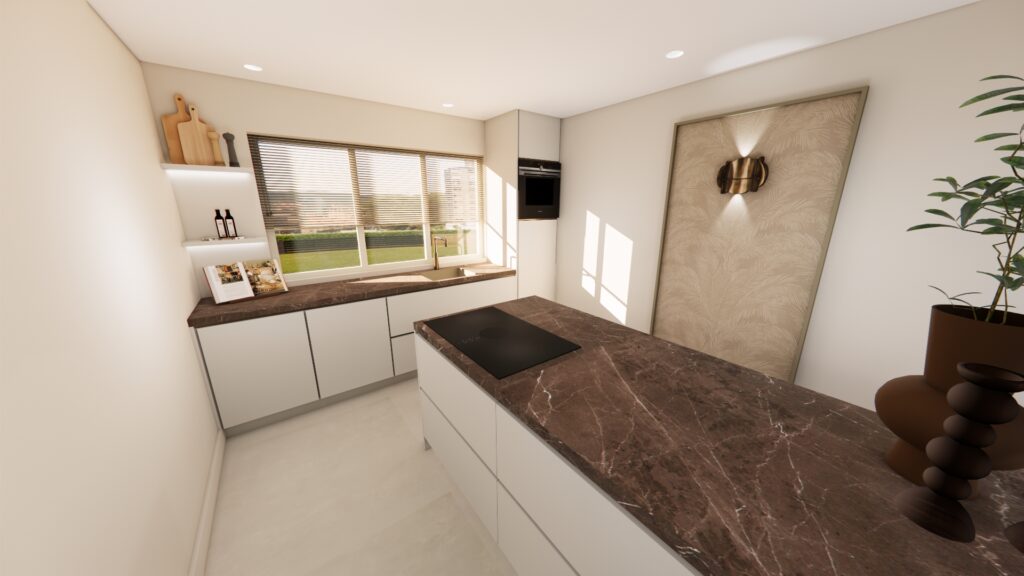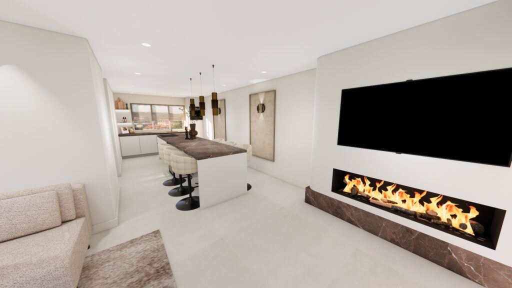 Daarnaast wilden de bewoners de indeling ruimtelijk houden, waarbij hun grootste wens een kookeiland is. Om de rust en openheid te behouden, heb ik ervoor gekozen het eiland te laten doorlopen in een eettafel. Zo ontstaat er één groot, harmonieus geheel. De zitruimte wordt compleet gemaakt met een royale bank en een cinema wall met zachte, ronde vormen, die zorgen voor een sfeervol en comfortabel resultaat.