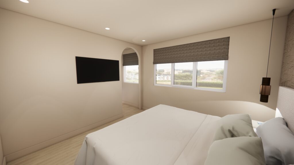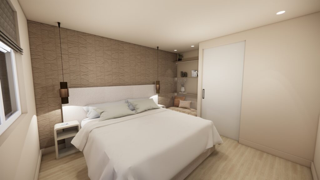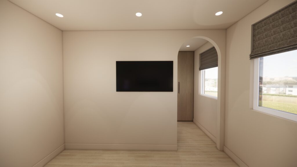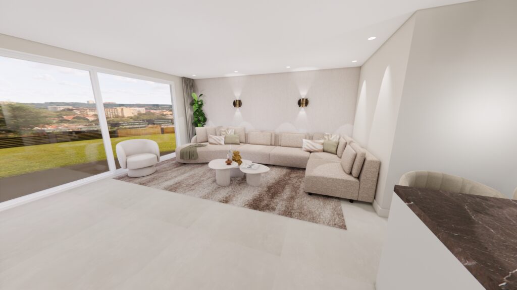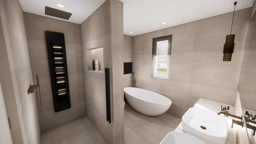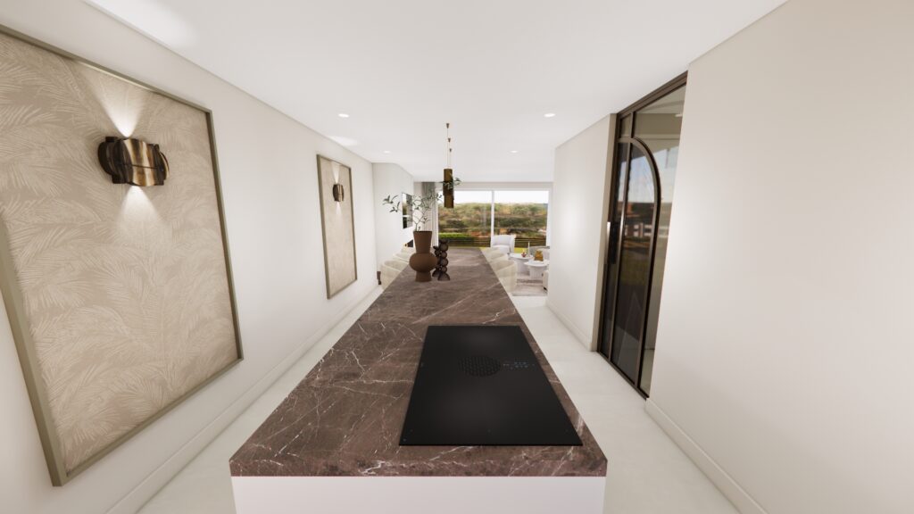 Daarnaast wilden de bewoners de indeling ruimtelijk houden, waarbij hun grootste wens een kookeiland is. Om de rust en openheid te behouden, heb ik ervoor gekozen het eiland te laten doorlopen in een eettafel. Zo ontstaat er één groot, harmonieus geheel. De zitruimte wordt compleet gemaakt met een royale bank en een cinema wall met zachte, ronde vormen, die zorgen voor een sfeervol en comfortabel resultaat.